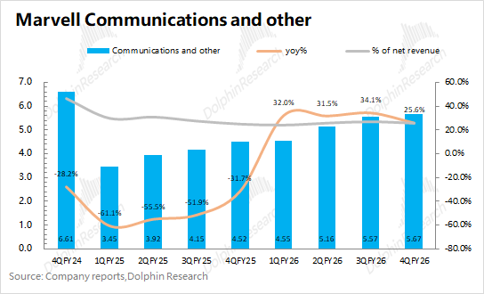 Marvell Technology reported revenue of US$570 million from communication and other business segments in the fourth quarter of fiscal 2026, marking a 25% year-on-year increase. This growth was primarily fueled by the recovery of the enterprise networking and carrier infrastructure businesses.