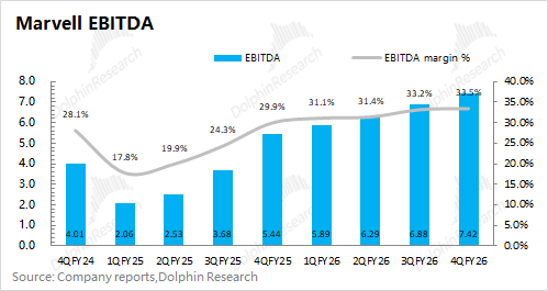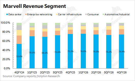 Marvell Technology's financial results this time largely aligned with market expectations, with revenue growth primarily driven by the data center business. After adjusting for amortization and other impacts, the company's adjusted gross margin was 58.5%, showing a slight 0.5% decrease sequentially due to the structural impact of a higher proportion of lower-margin custom ASIC and other businesses.