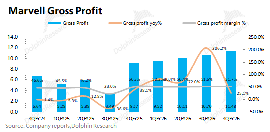 Marvell Technology achieved a gross profit of $1.15 billion in Q4 FY2026, up $80 million sequentially. The gross margin for the quarter was 51.7%.