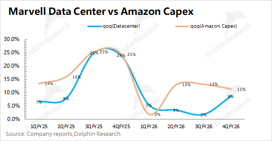 Dolphin Research believes this is primarily due to the slower growth of custom ASICs (the company expects growth to exceed 20%), indicating that Amazon is not entirely satisfied with Marvell's ASIC products.