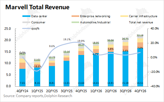 Marvell Technology achieved revenue of $2.22 billion in Q4 FY2026, up 7% sequentially, meeting market expectations of $2.21 billion. The company's revenue growth this quarter was primarily driven by the data center segment, with custom ASIC and optical interconnect products as the main contributors.