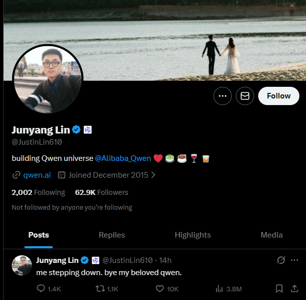 Early this morning (March 4), Lin Junyang, the technical lead of Alibaba’s Tongyi Qianwen (Qwen) project, took to social media to bid farewell to the Qianwen team, writing, “I’m stepping down, my dear Qwen.”