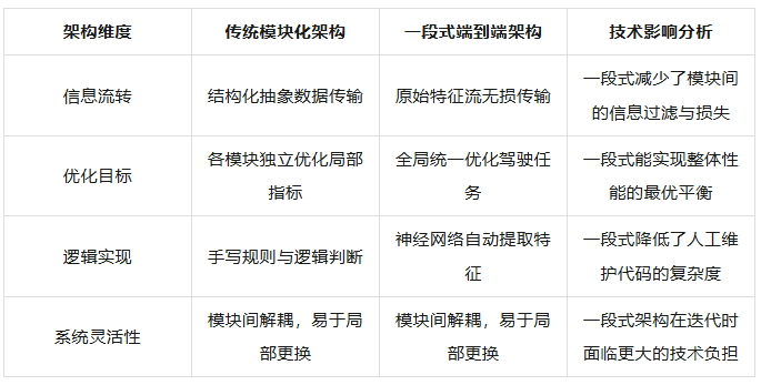 Although the single-stage end-to-end architecture theoretically raises performance ceilings, it also blurs system boundaries. In traditional architectures, if perception fails, it is clear which algorithm module failed to identify the target. In contrast, in a single-stage model, perception, prediction, and planning are intertwined. This deep coupling means that any local fine-tuning may trigger unforeseen global fluctuations. The system's optimization objective shifts from local metrics of individual modules to overall driving performance, enhancing system efficiency while significantly increasing training complexity and dependence on high-quality data.