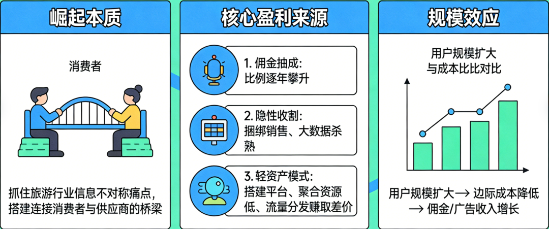 The rise of OTAs essentially stemmed from addressing the pain point of information asymmetry in the travel industry by building a bridge between consumers and suppliers, thus achieving a high-return, effortless profit model.