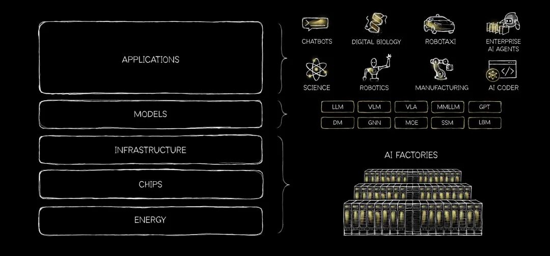 Above it, chips determine computational efficiency, infrastructure serves as factories for chip clusters, models understand multi-domain knowledge, and applications ultimately bear commercial value.