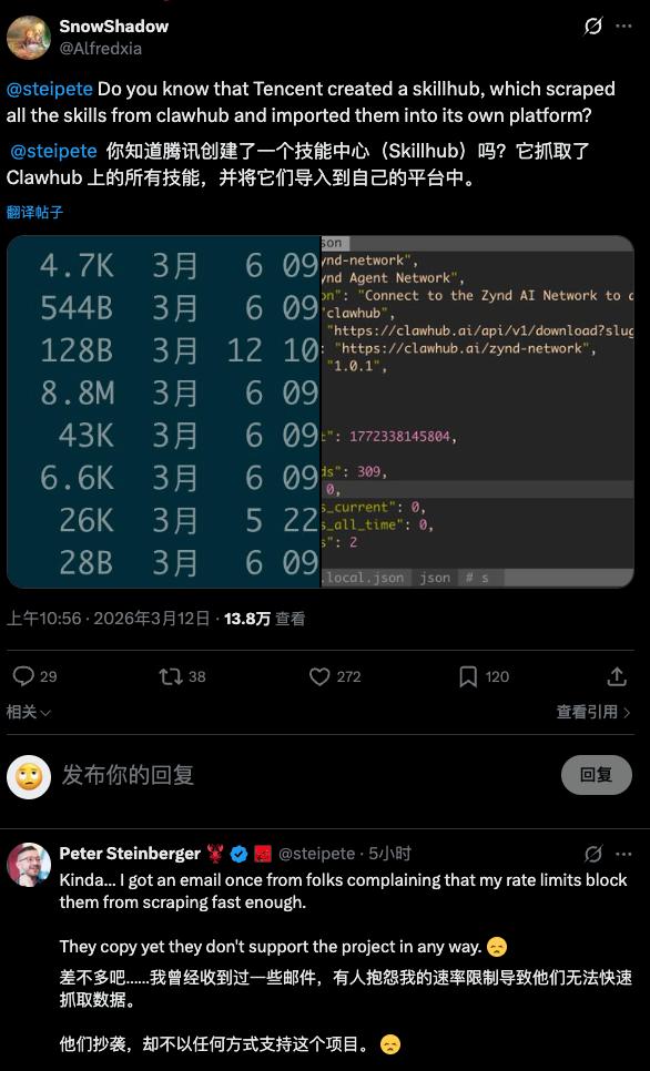 Tencent recently launched the AI skill community SkillHub, but OpenClaw's founder publicly criticized Tencent on social media, accusing them of "plagiarizing without supporting the project in any way."