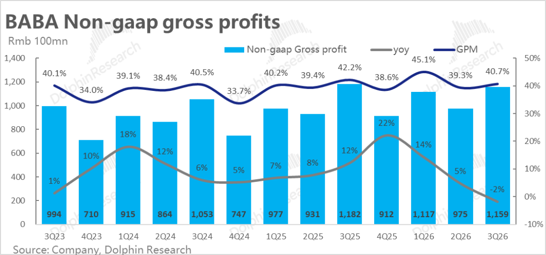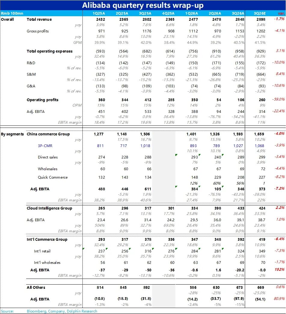 Overall, the group's adjusted EBITA was RMB 23.4 billion, down approximately 43% YoY. While the significant reduction in food delivery losses this quarter represents a notable improvement from the less than RMB 10 billion profit in the previous quarter, the core Taobao and Tmall business profits may have declined YoY, international e-commerce incurred losses again, and losses in other new businesses expanded more than expected. Overall, profit performance remains relatively poor.