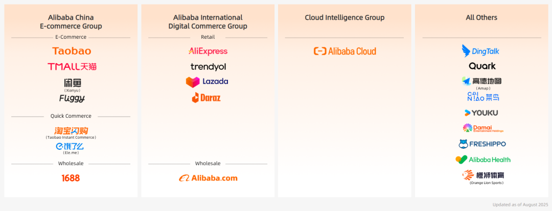 In FY26, with Ele.me's instant retail and Fliggy's travel businesses merged into the original Taobao and Tmall Group to form the new China E-commerce Group, Alibaba's organizational structure and financial reporting framework have been updated again. As shown below, Alibaba Group's new structure comprises four segments: