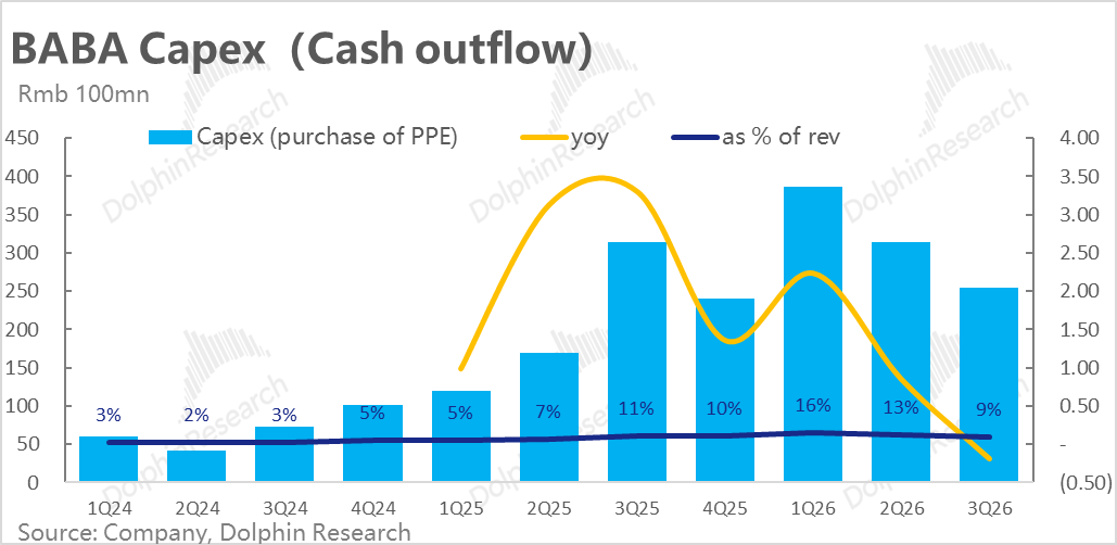 Additionally, Capex spending for the quarter was RMB 29.9 billion, with cash Capex at RMB 25.3 billion, a decline from the previous quarter. Since FY26, investments have continued to narrow, possibly influenced by the ban on Nvidia chips.