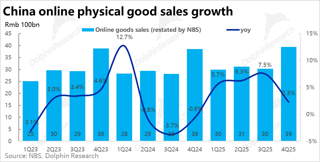 However, one incentive (contributing factor) to Q4's weak e-commerce growth was delayed consumption due to a later Chinese New Year. Recently released online commodity sales (commodity sales) growth exceeded 10% in January-February, showing a clear rebound. Combined, Q4 2025 + 2M 2026 online retail sales grew around 5.4% YoY—slowing but not as bad.