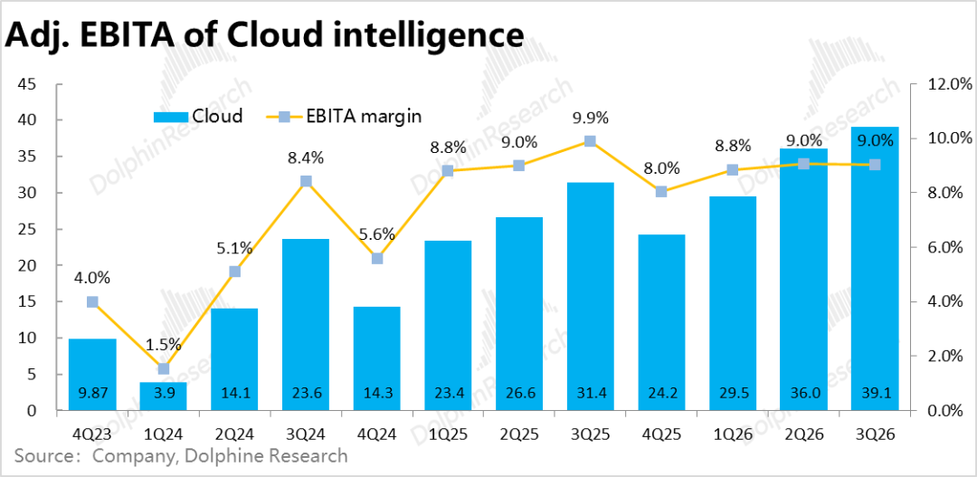 Meanwhile, Alibaba Cloud's profit margin remained at 9%, unchanged from last quarter, without any drag from the rising proportion of AI business—a decent outcome.