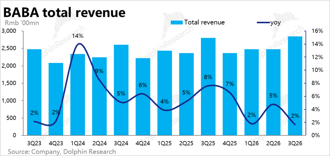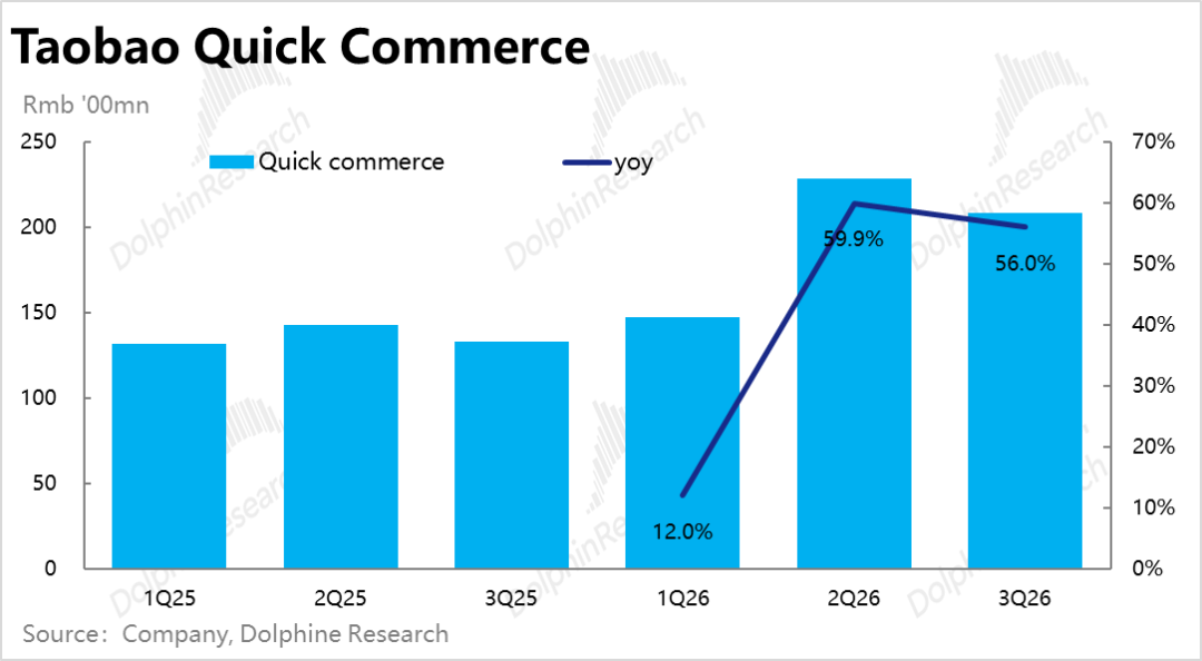 2. Taobao Flash Sales + Ele.me: Taobao's instant retail revenue for the quarter approached RMB 20.8 billion, up 56% YoY. More critically, on a quarter-on-quarter basis, it declined by 9%, slightly worse than Dolphin Research's expectations.