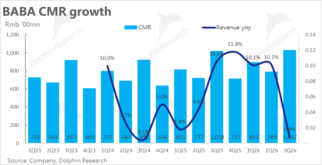 1. Core Business - Key Metric for Long-Distance E-commerce: CMR was RMB 102.7 billion this quarter, up just 0.8% YoY, a significant slowdown. Similar to JD.com, this reflects the waning impact of 2025 government subsidies, a high base in 2024, and a later Chinese New Year, resulting in only 2.3% growth in Q4 online physical retail overall, with Taobao and Tmall's GMV growing slightly slower than the industry.