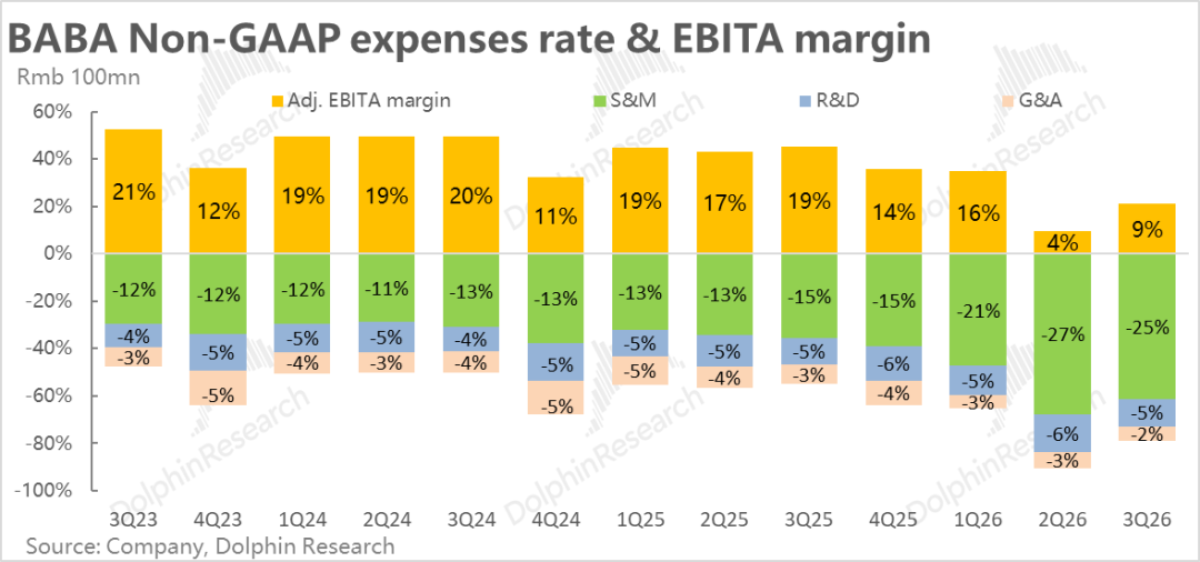 Ultimately, the group's adjusted EBITA was RMB 23.4 billion. While improved from last quarter's sub-RMB 10 billion profit due to narrowed food delivery losses, core Taobao and Tmall business profits likely declined YoY, international e-commerce returned to loss, and losses from other new businesses widened more than expected, indicating poor overall profit trends.