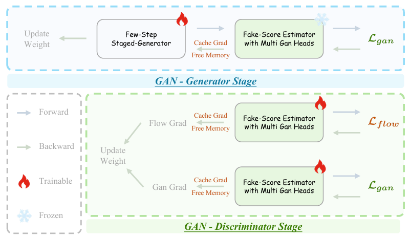 To address this, Helios introduces adversarial post-training based on real videos. If the student's output after denoising is merely an imitation of the teacher and lacks authentic physical details, it is sent back for revision.