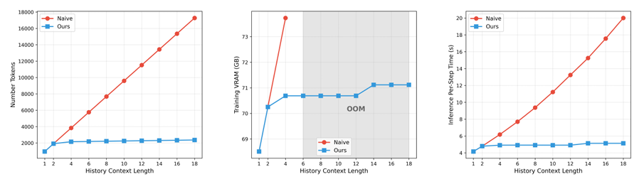 This simple approach keeps the token consumption for reviewing distant historical frames at an extremely low and constant level, compressing memory usage for historical information to one-eighth of the original, completely eliminating the insolvable problem of 'memory explosion' on a single GPU.