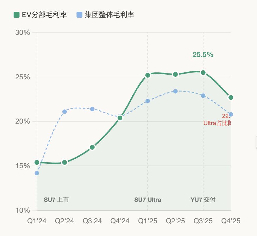 The ASP (average selling price) of smart electric vehicles also rose, increasing from approximately RMB 234,000 in Q4 2024 to about RMB 250,000 in Q4 2025—a 6.6% increase primarily driven by deliveries of the higher-priced YU7 series.