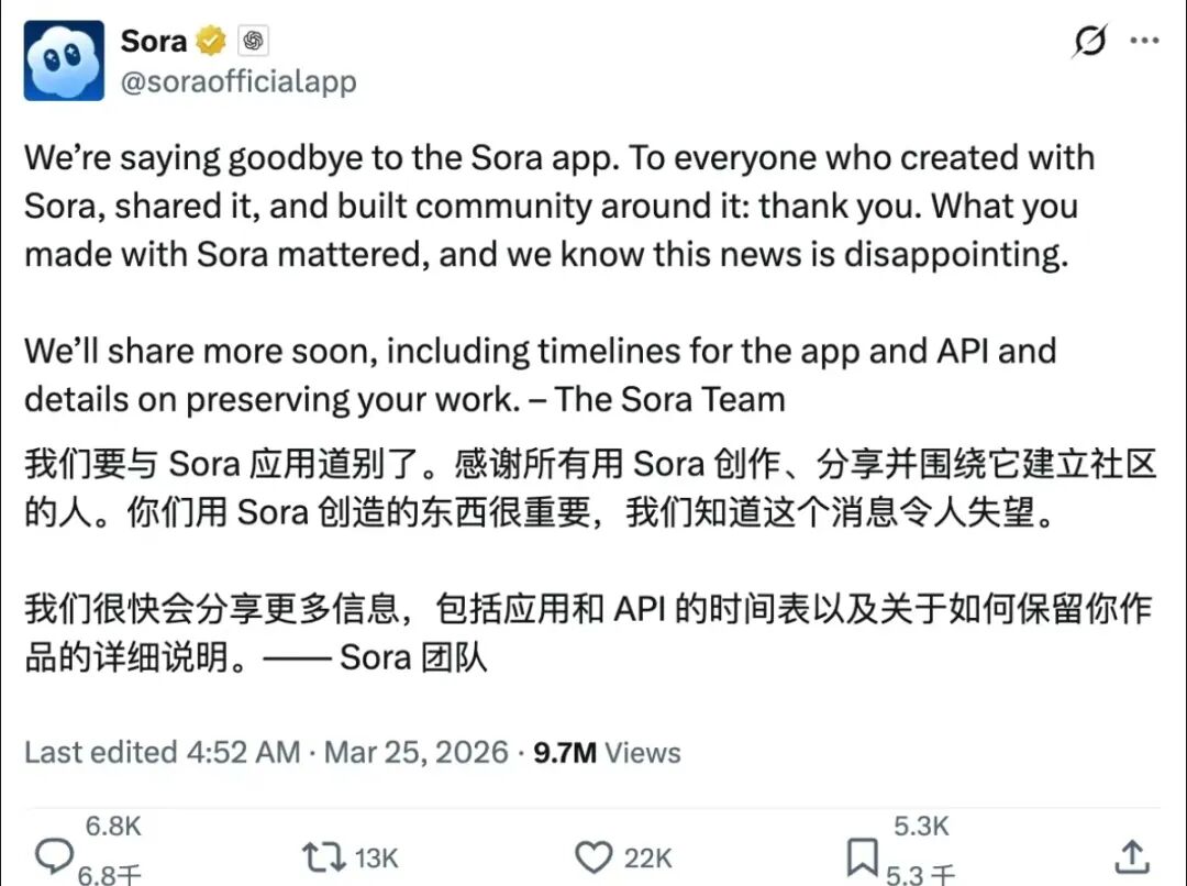 OpenAI's shutdown of Sora should not be simply interpreted as a technical failure or strategic blunder but rather as a realistic strategic adjustment. It exposes the deep-seated contradiction in current AI video commercialization: the disconnect between the pace of technological breakthroughs and the maturity of business models.