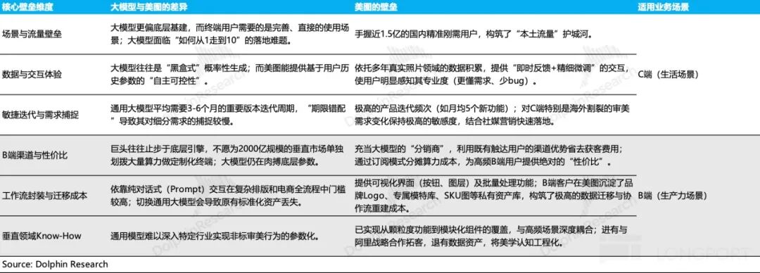 A) On the C-end, Dolphin Research still believes that Meitu's foundational 'editor' functionality provides 'autonomy and controllability,' which can retain moderate and heavy users in the short term (medium to long term depending on the pace of AI development), ensuring stable user retention. Since image editing inherently relies on subjective user judgment, which is non-standardized, interactions with large models via natural language still involve hallucinations and uncertainties.