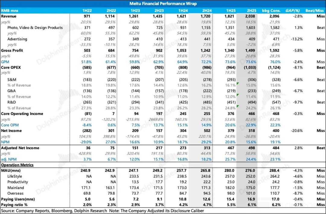 On March 27, Beijing time, after the Hong Kong market close and before the U.S. market open, Meitu released its financial report for the fiscal year 2025. The performance in the second half of 2025 was underwhelming, with revenue missing expectations and gross profit significantly lower. However, expense control exceeded expectations, keeping operating profit largely in line. Nevertheless, the user ecosystem contributing to subscription revenue was under significant pressure, leading to an overall negative impression from Dolphin Research.