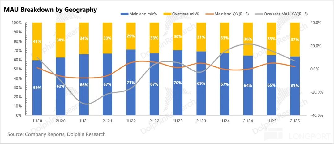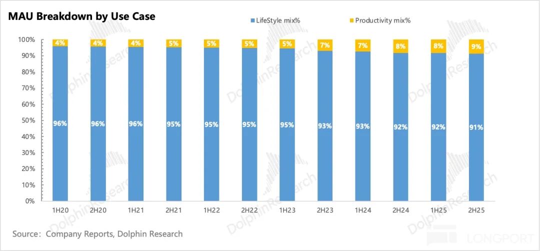 a) MAU: The call explained the decline in MAU in the second half of the year by citing the maturation of domestic lifestyle products and slowing growth. However, the MAU for productivity scenarios, which Dolphin Research is more concerned about, stood at 24 million and was not addressed. Although the B-end is still in the penetration phase in terms of user structure, growth significantly slowed from 36.83% in 2023 to 8.17% in 2025.
