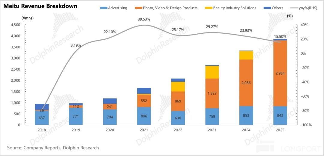 Since the release of Meitu's 1H25 financial report, its market capitalization has halved. From a market environment perspective, geopolitical risks have driven capital toward assets with high certainty. Additionally, the notion that 'AI is replacing software' has intensified as large model providers transition from Chatbots to the Agent era. Was Meitu wrongly penalized? In our initial coverage, Dolphin Research discussed Meitu's barriers against the impact of large models, with the following key points: