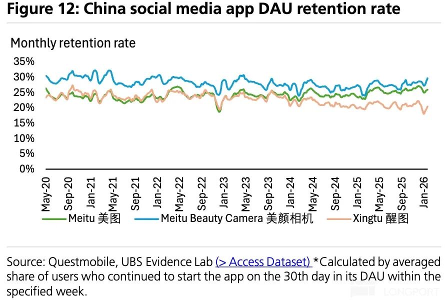 In summary, the C-end foundation has been undermined, leading to a significant drop in valuation. Fortunately, the competitive landscape remains relatively benign. The C-end business, with nearly 250 million users, remains the company's focus. According to UBS monthly tracking data, Meitu's MAU share in its product categories has remained stable, and it continues to lead the domestic photo editing market.