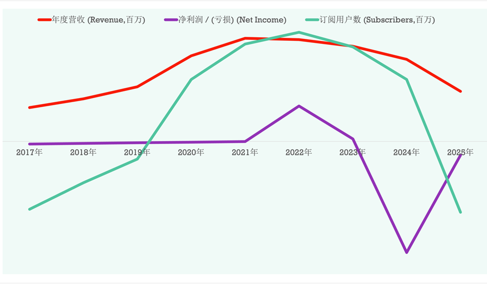 Figure: Chegg experienced revenue and user turbulence from 2017 to 2025