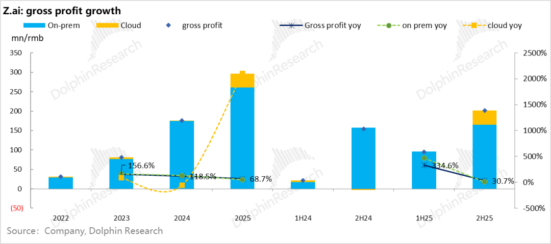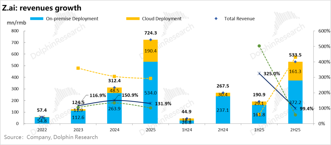 In stark contrast, cloud-based deployments such as API interfaces and open platforms, which the market truly favors, surged 430% year-over-year in the latter half, reaching 160 million. The full-year API-related business hit 190 million, nearly on par with MiniMax's 180 million. Moreover, in terms of growth trajectory, Zhipu's nearly 300% annual growth outpaces MiniMax's 200%, showcasing greater explosiveness.