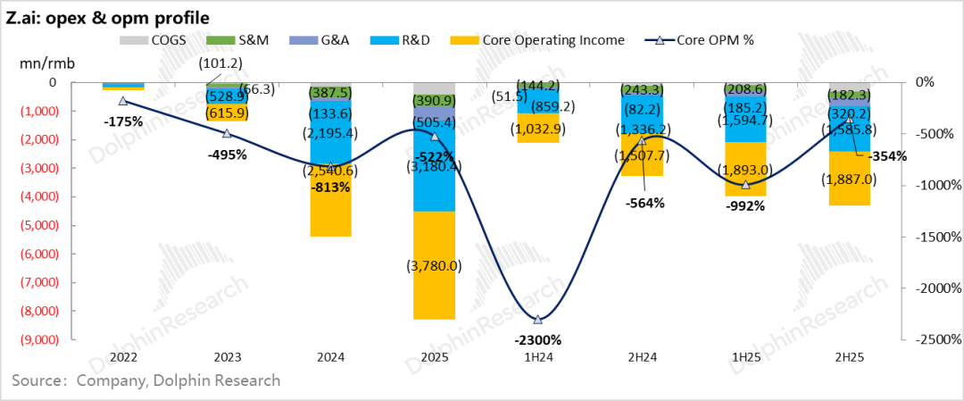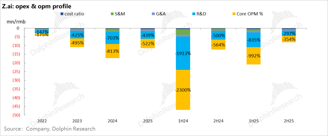 General and administrative expenses were 320 million, up 290% year-over-year—relatively fast. But like MiniMax, Zhipu's sales expenses fell 25% year-over-year to just 180 million in the latter half (model acquisition relies on the model's capabilities, not marketing).