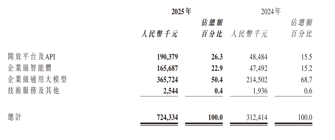 Zhipu's revenue structure underwent dramatic changes over the past year. For the first time, the financial report further segmented its business beyond on-premises and cloud deployments into enterprise-grade general-purpose large models, open platforms & APIs, enterprise-grade agents, and core services & others.