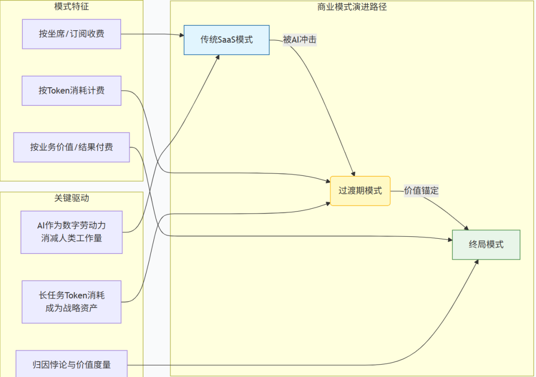 Chart: Agent Business Model Transition: License → Token → Pay for Results. The value anchoring for long tasks is key to this transition. Source: Jinduan Research Institute