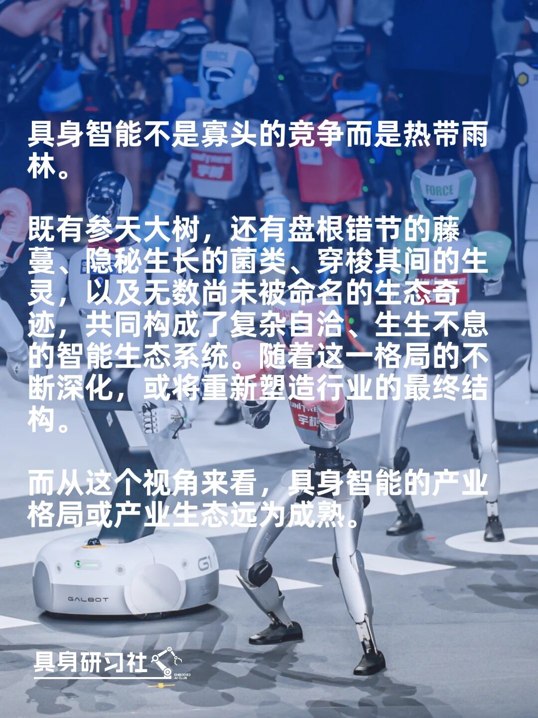 It is important to clarify that embodied AI resembles a rainforest—featuring not only towering trees but also intertwining vines, hidden fungi, Creatures shuttling between them (Note: retained as-is for poetic effect; could translate as " Shuttle through it creatures" if needed), and countless unnamed ecological wonders. Together, they form a complex, self-sustaining, and ever-evolving intelligent ecosystem.