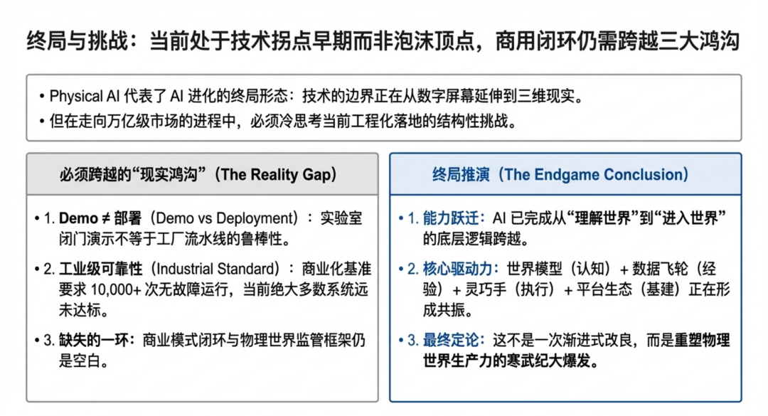 The gray rhino of safety and regulation. When thousands of autonomous robots enter factories or even homes, who takes responsibility for accidents? Currently, global regulatory frameworks for Physical AI are virtually nonexistent.