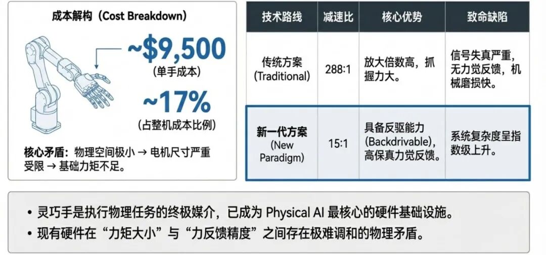 The challenge with dexterous hands lies in a fundamental contradiction: fingers have too little space for large motors; small motors lack sufficient torque, requiring high-reduction gearboxes to amplify force; but high-reduction gearboxes introduce inertial distortion, loss of force feedback, and mechanical wear—three issues that 'poison' AI's learning process at the physical level.