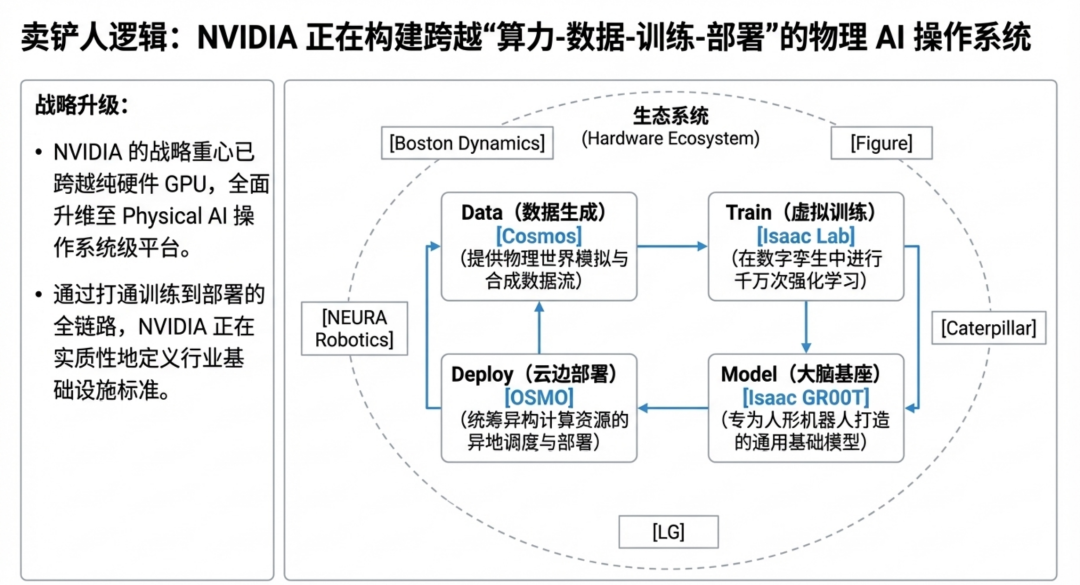 During the large model era, NVIDIA became the biggest beneficiary through its GPU and CUDA ecosystem. In the Physical AI era, its role is further upgrading—not just providing computing power but attempting to build an entire infrastructure for the robotics age.