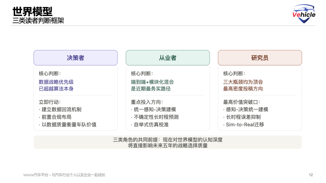 Practitioners: Hybrid architectures combining end-to-end and modular designs will coexist in the near term. The most pragmatic path currently is to use world models as an intermediary layer connecting perception and planning, rather than entirely replacing existing architectures. Three of the most worthwhile technical directions are: unified perception-decision modeling, uncertainty-aware long-term prediction, and world model-based self-bootstrapping simulation calibration.