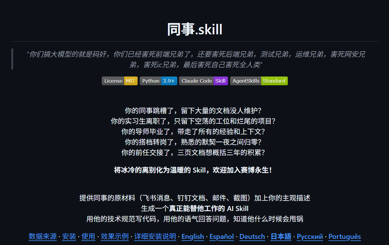From the open-source content on GitHub, colleague.Skill is essentially a prompt word + crawler engineering project that follows the AgentSkills standard. What it does is very simple: it organizes the raw text you provide into a unified format, then has AI summarize the person's Persona and Work Skill to form a corresponding digital employee.