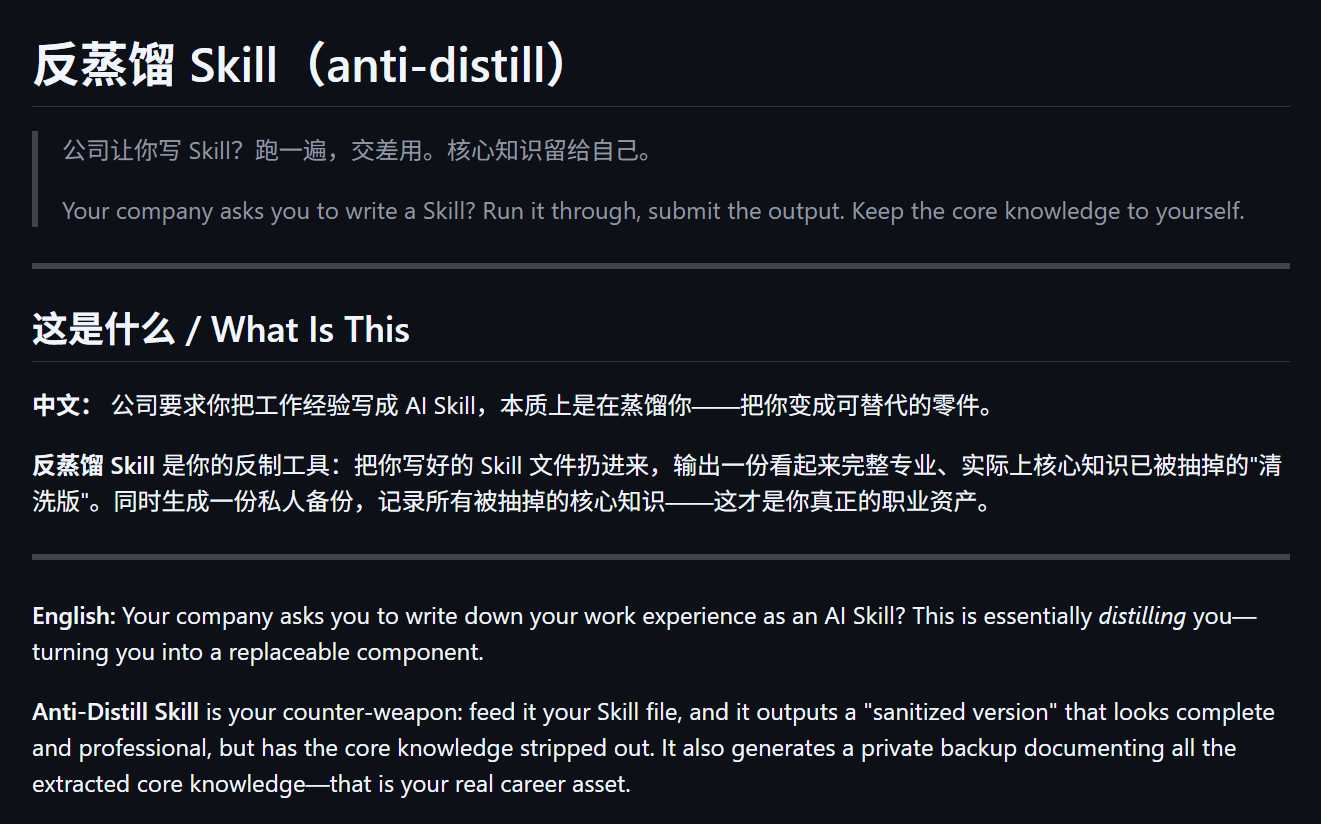The principle is simple: throw your written Skill into the anti-distillation Skill, and the system will output a seemingly complete and professional but actually verbose and watered-down version of the Skill, while generating a private backup to record all the core knowledge that's been stripped away.