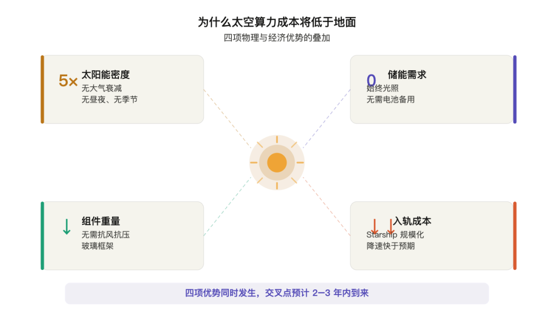 This is the most underestimated judgment in the entire speech and the most counterintuitive discovery worthy of industry reflection. Musk said he believes that within two to three years, the comprehensive cost of deploying AI chips in space will be lower than deploying them on the ground. This sounds like science fiction but is backed by the superposition of several physical and economic facts: