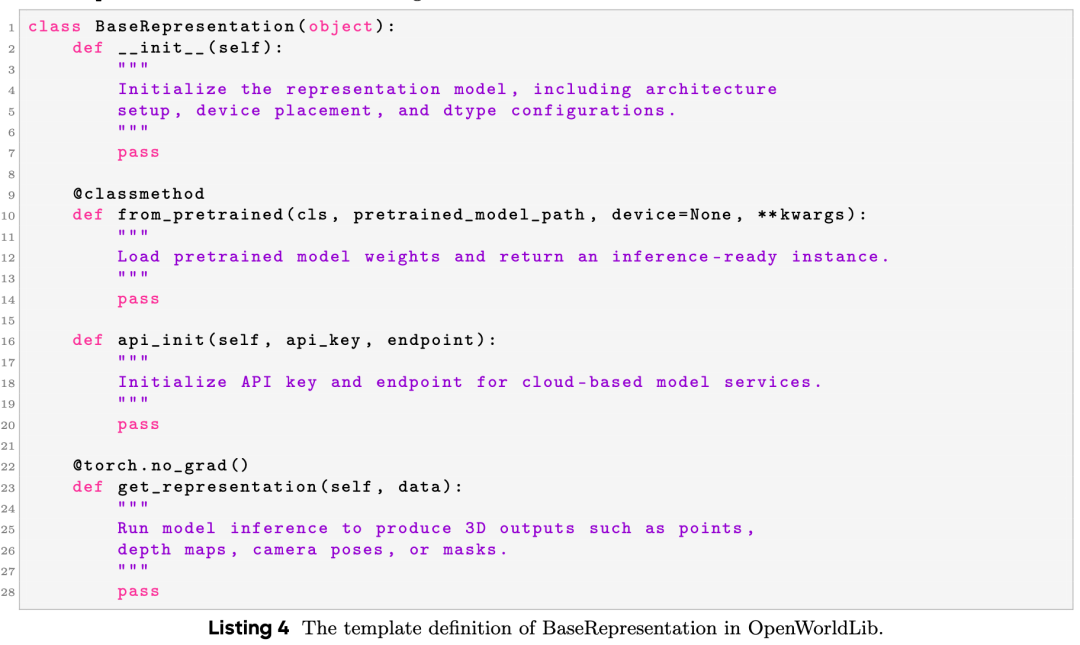 To standardize the usage of these models, we provide a unified BaseRepresentation template. All task-specific representation classes inherit from this base class to ensure consistent APIs. The definition of BaseRepresentation is shown in Listing 4.