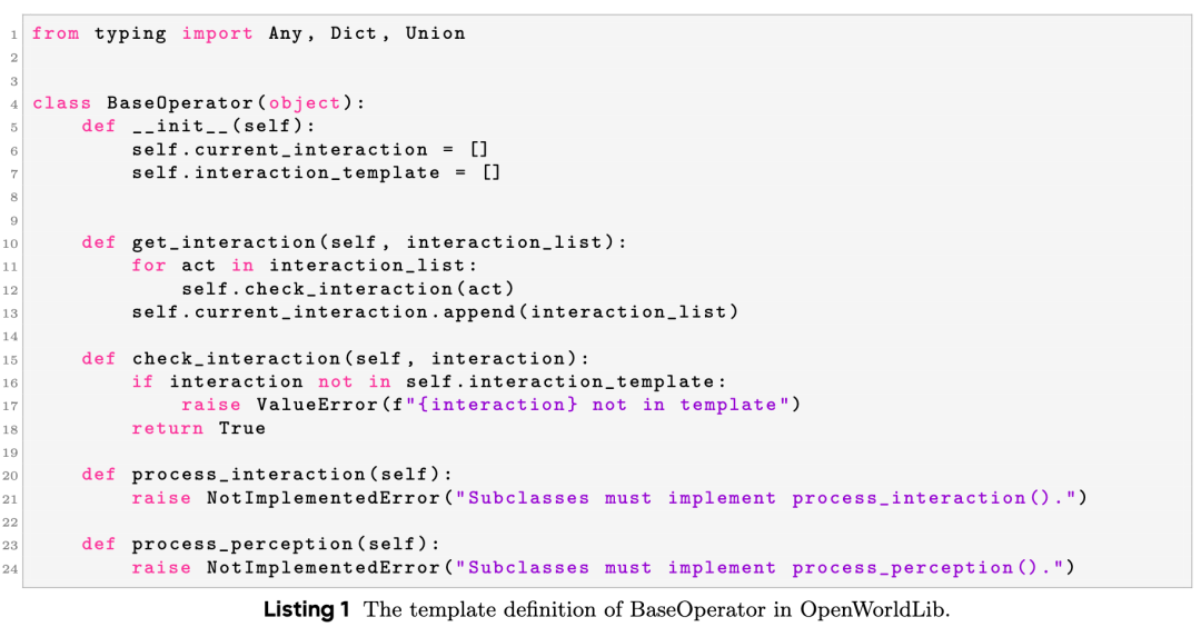 To facilitate the integration of new world model methods, this paper defines a unified Operator template. All task-specific operators inherit from this base class, ensuring a unified API across the entire codebase. The Operator's definition is shown in Listing 1.