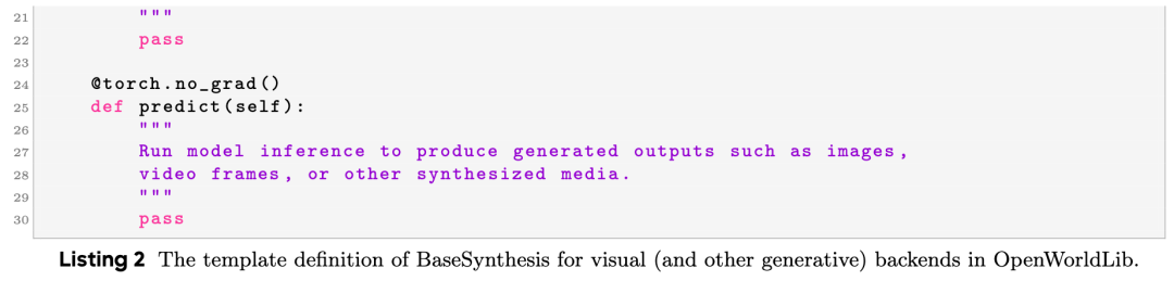 To facilitate the integration of new reasoning-oriented world model approaches, a unified BaseReasoning template is defined. All task-specific reasoning classes inherit from this base class, ensuring API consistency across the codebase. The definition of BaseReasoning is shown in Listing 3.