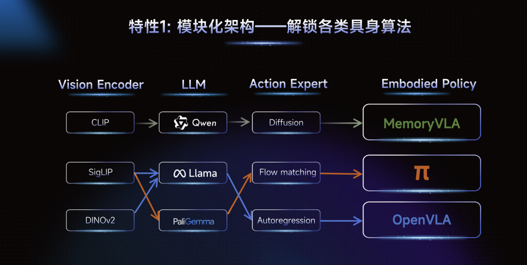 Today, when it comes to embodied intelligence, VLM, visual encoders, and action generation sequences' action experts can all use different companies' solutions. From a more universal perspective, if you want to provide infrastructure similar to scaffolding, you shouldn't be tied to a specific model structure but rather give everyone ample choice. The design philosophy of Dexbotic is to encourage everyone to freely create their own experiments and structures. We have achieved better engineering decoupling, allowing different modules to be combined with each other.
