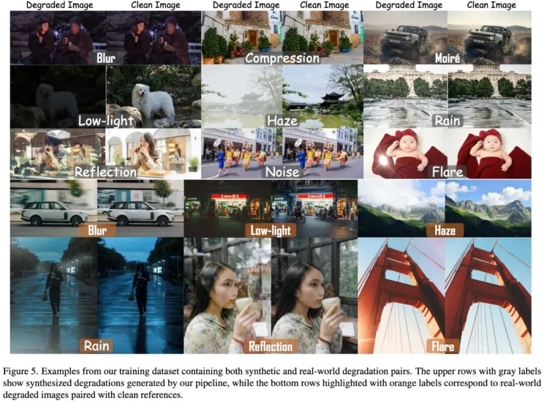 Synthetic + real hybrid data construction. The authors did not simply stack data but used both synthetic and real degradation pairs to balance scalability and authenticity.