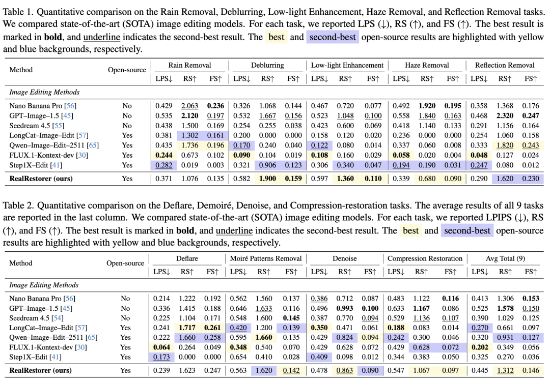 Balanced Performance Across Multiple Tasks: The paper shows that RealRestorer performs strongly across nine task categories, achieving the best results in deblurring and low-light enhancement and ranking second in moiré removal. Overall, it ranks first in five categories and second in two among open-source models.