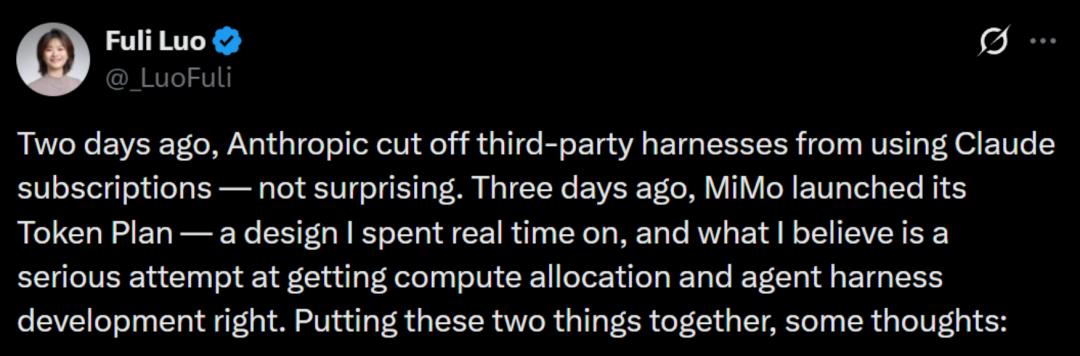 A few days earlier, Anthropic suddenly announced that it would cut off third-party tools' access to Claude subscriptions, prompting Luo Fuli to discuss the logic behind Token pricing.