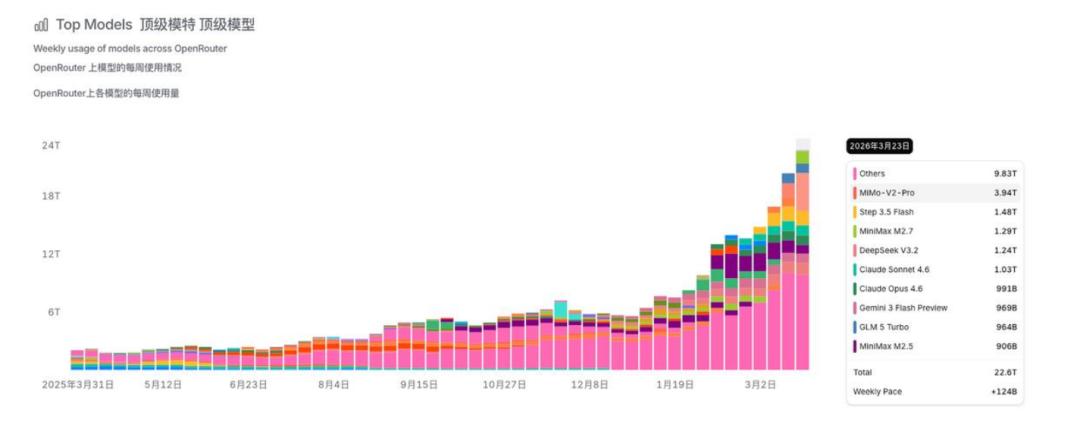 Data from OpenRouter, a global large model aggregation platform, shows that Chinese large models have surpassed overseas models in weekly call volume for a month straight, with domestic models like Xiaomi, JieYue XingChen, and Minimax leading the rankings.