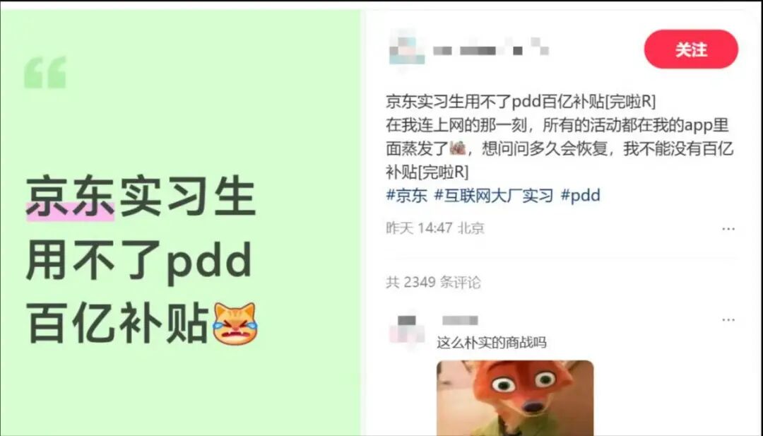 Recently, a JD.com intern complained on a social platform that after connecting to the company's network, the billion-dollar subsidy feature on Pinduoduo mysteriously disappeared, ending the post with a question: 'When will it be restored?'