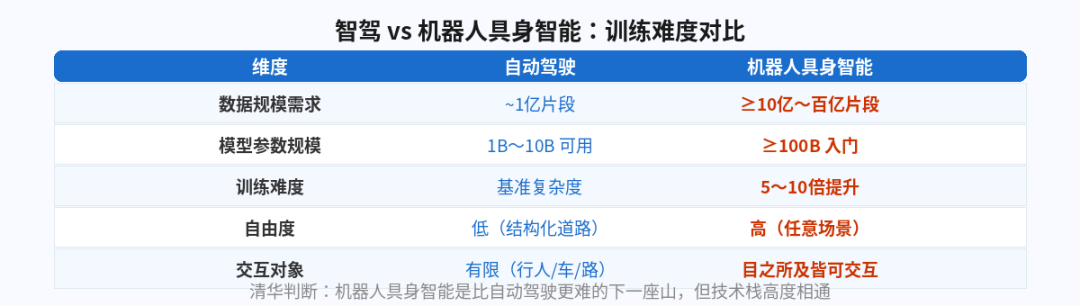 ④ From Intelligent Driving to Robotics: Data requirements increase from 100 million to billions, model requirements from 1B to 100B, and training difficulty increases by 5–10 times. Cars represent the optimal training ground for the robotics domain.